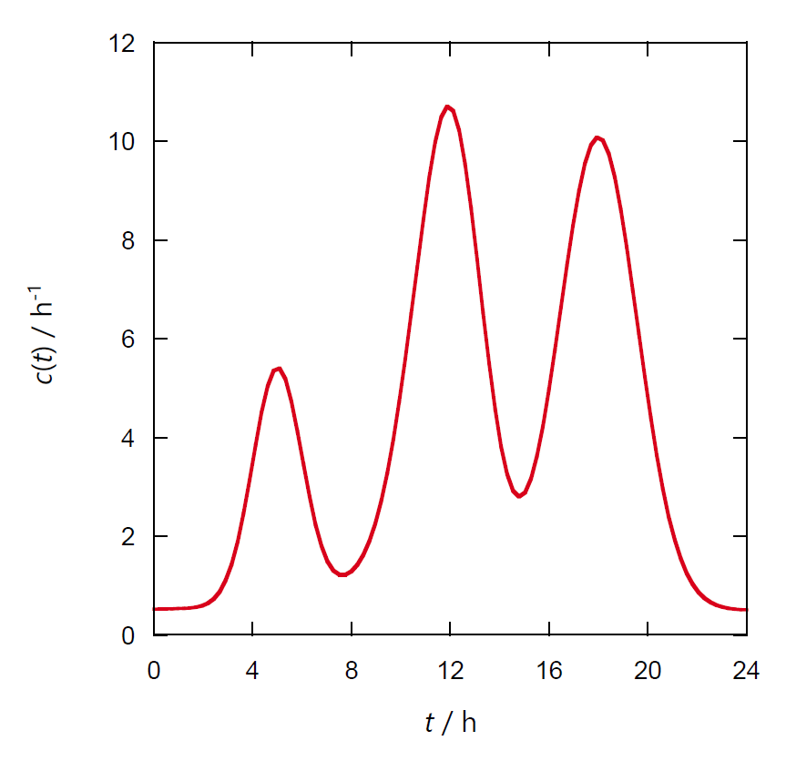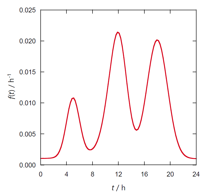| 図 1a. 時刻ごとの来客の分布関数 \(f(t)\)。 | 図 1b. 1 日の来客の積算分布関数 \(F(t)\)。 |