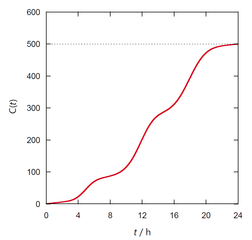 ここでランダム変数として考えられているのは、来客時刻です。 客の来る時刻はさまざまに変動し、それを捉えようとしたのが、 図 1 に示す分布関数と積算分布関数になっています。 分布関数からは 1 日の店の稼働状況、特徴が明瞭につかめます。 朝が早い街らしく午前 5 時頃にピークがあり、12 時頃と退け時の午後 6 時頃にも来客のピークがあります。 一方、店の売り上げに関心があれば、 (客単価が変わらなければ)積算分布関数からは、早朝から店を開けなくても、 10 時開店で売り上げは 8 割弱程度は確保できそうだということが明瞭です。 化学や物理の分野では、それぞれの現象の詳細な特徴に興味が向きがちで、 積算分布関数よりは、その微分形である分布関数が前面に出てきます。