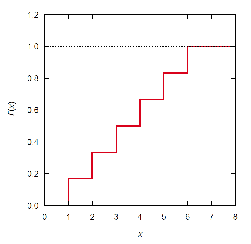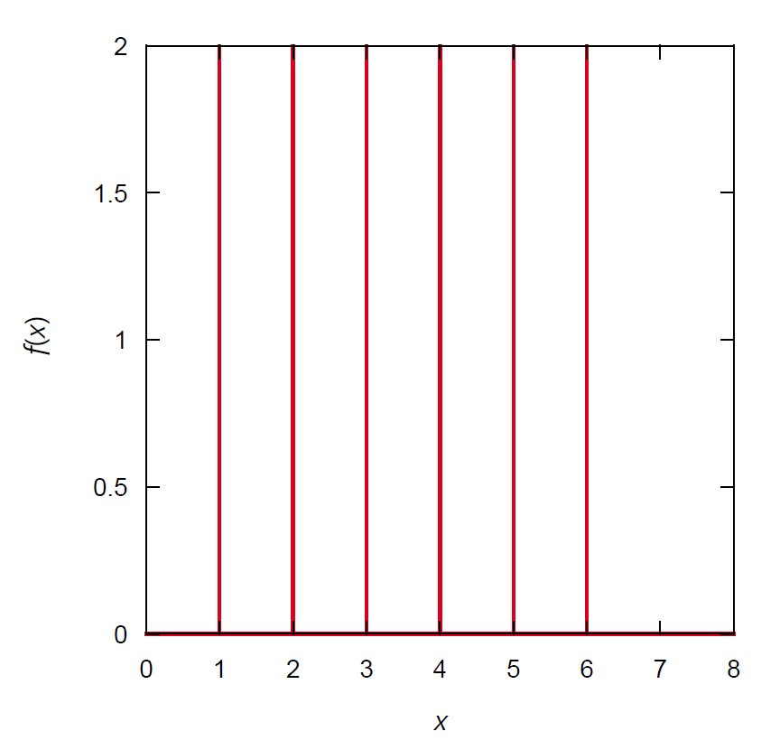 このおはなしでは、話を簡単にするためにランダム変数が離散的な場合は扱いません。 離散的なランダム変数を扱う場合には、量子力学でお馴染みのデルタ関数が登場し、 たとえばサイコロを振って出る目の場合、分布関数は \[ f(x) = (1/6) \sum_{i=1}^6 \delta (x - i) \] 積算分布関数は \[ F(x) = (1/6) \sum_{i=1}^6 U(x - i) \] となります(\(U(x)\) は単位関数)。
