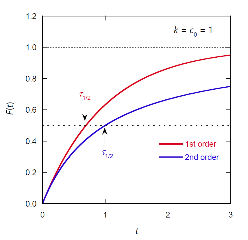 それぞれの寿命の分布関数を図 1 に、積算分布関数を図 2 に示しました。 2 次反応の場合の分布関数が、裾を長く引いていることが分かります。 また積算分布関数で \(F(t) \)= 1/2 となる時刻 \(t\) は半減期 \(\tau_{1/2}\) と呼ばれ、 統計の分野の言葉で言えば、寿命分布のメディアン(中央値)に相当します。