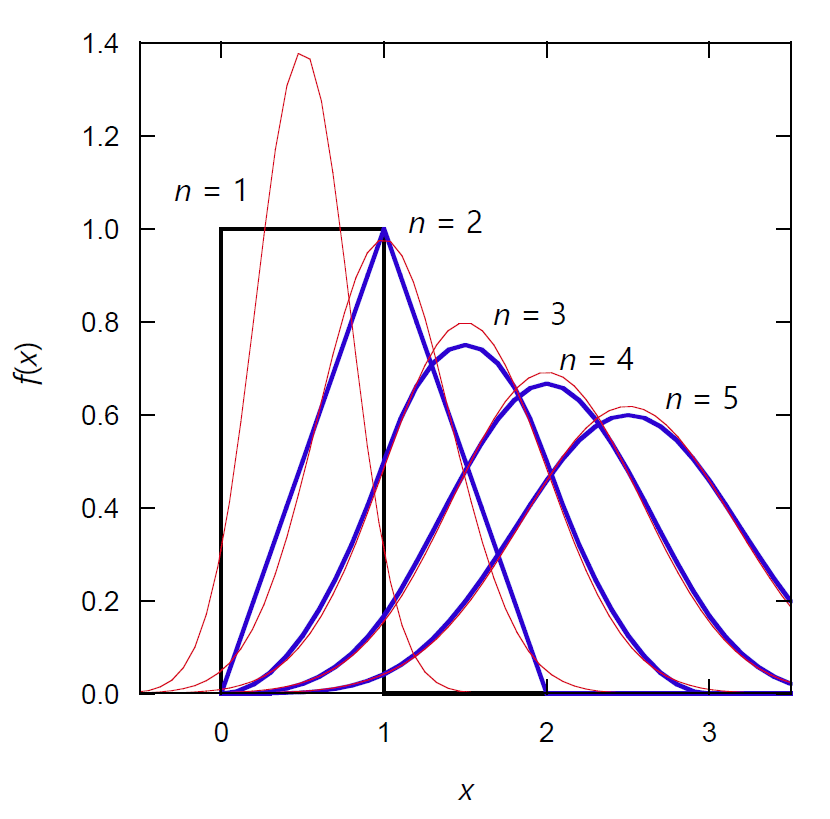 ここで \(U(x)\) は単位関数(階段関数)です。 図には \(n\) = 5 まで計算した結果を示しました。 図中、対応する平均と分散を持つ正規分布 N(\(n/2\), \(n/12\)) も示しています。 最初の箱型の分布関数が、畳み込み積分を順次行うにつれ、 正規分布に近づいていきます。