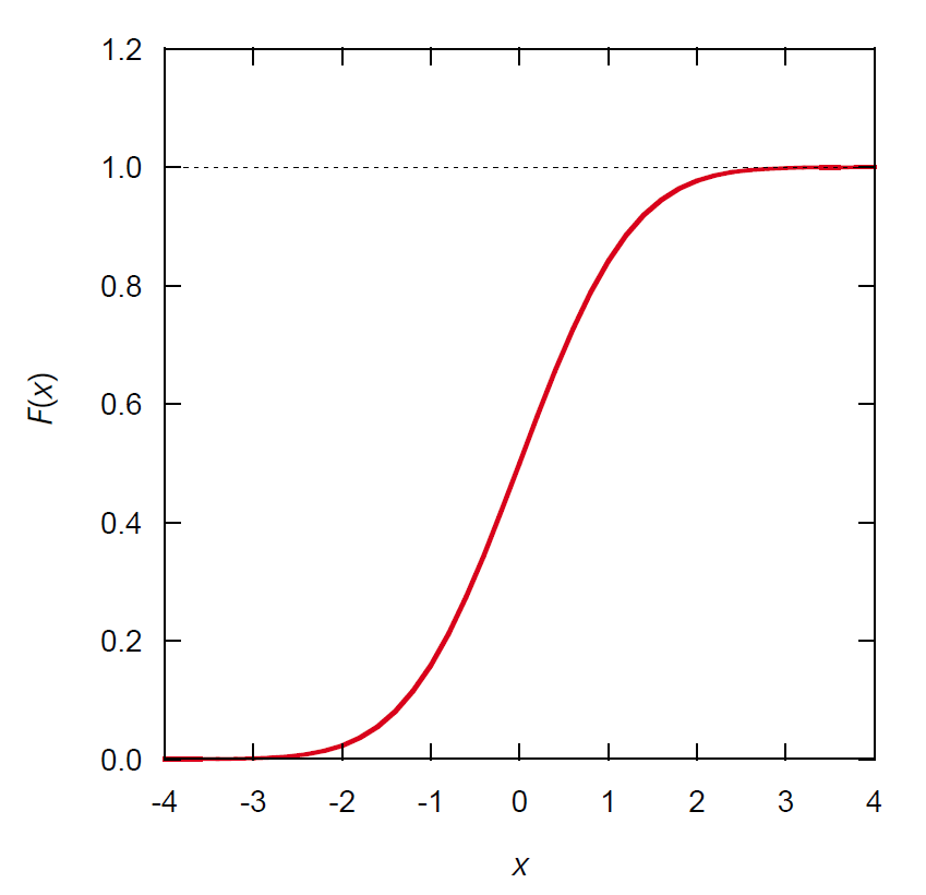 | 図 1a. 標準正規分布 N(0, 1) の分布関数。 | 図 1b. 標準正規分布 N(0, 1) の積算確率分布。 |