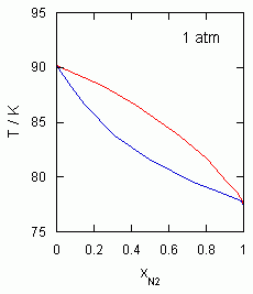 横軸は窒素のモル分率 青線は沸点(対応する組成の液体が沸騰する温度)、赤線は露点(対応する組成の蒸気が凝縮する温度)。 |