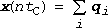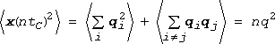 液体の中で分子は周りの分子と衝突してを繰り返しながら移動していきます。 仮に衝突の時間間隔をtCで一定とし、i番目の衝突との間に進む距離をqi (ベクトル)とすると、n回の衝突の間に進む距離xは、各回の衝突の間に進む距離の和をとればよいわけですから次の式のようになります: