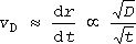 という関係を得ます。 ここで平均自由行程 q に平均速度 v をかけたものを、定数 D の 6 倍とおきました(6 倍したのは3方向の成分を考慮したためです)。 この定数 D を拡散係数と呼びます。 拡散の速さ vD はこの半径 r の時間変化と考えられ、次の式のように時間の平方根に反比例して小さくなっていきます*。