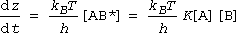 化学反応の遷移状態理論といわれるものは、反応の中間のもっとも不安定な状態AB*(遷移状態)の分解する速度を kBT/h で評価しようとするもの(ここで h はプランク定数と呼ばれる定数で 6.63×10-34 J s)で、反応速度定数は