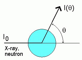 | 回折実験の模式図(右)と、X線回折実験による構造因子の例(左)。 なおX線回折実験では構造因子を求める際、入射強度と回折強度の比 I(θ)/I0 から、各原子内での回折による寄与(原子散乱因子)を取り除く。 |