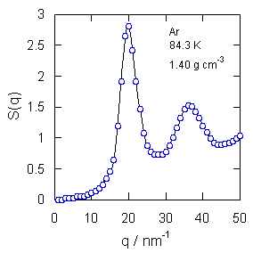 液体中で分子はでたらめな配置を取っていると考えてよいのですが、反発力が働いてある距離以上には近づけないなど、近傍の分子の配置との間には何らかの秩序が存在するはずです。 このことは実験的にはX線や中性子線の回折実験から分かっています。 入射した中性子線の、ある角度 θ への散乱強度を調べると、図のようなパターンが得られます(構造因子と呼びます。 ここで Q = (4π/λ) sin(θ/2)で、λは中性子線の波長、θは散乱角)。