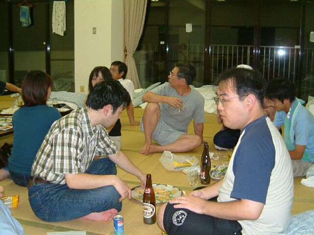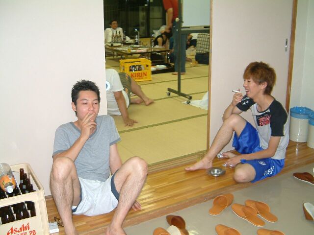 宴席の外でタバコをくわえ、くつろいだ人たち。