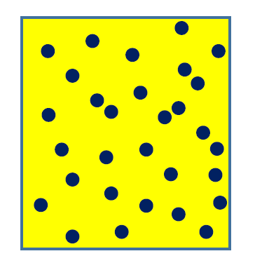 | 図 1-1. 理想気体 X -ファンデルワールス流体 A 混合物の”分子論的”イメージ。 相互作用しない X 分子 からなる理想気体中で、 A 分子(図中の●)が相互作用しながら運動しています。 |