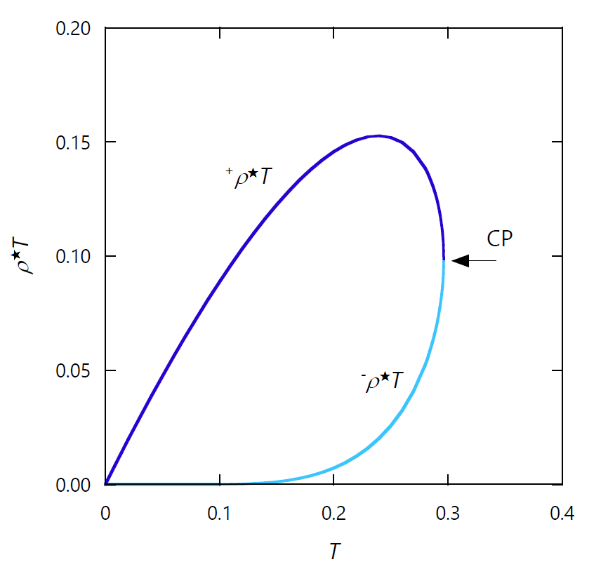 ここで重要になるのは、純ファンデルワールス流体の気液平衡状態の密度に温度をかけたもの \({}^{\pm} \rho^{\star}(T) T\) の挙動です。 \({}^{\pm} \rho^{\star}(T) T\) は、 ビリアル定理からいえば、 飽和密度におけるファンデルワールス流体の圧力に対する分子の並進運動の寄与と言え、 以下では「並進運動の圧力」と呼ぶことにします。 図 3-1 に横軸に温度を取った形で、並進運動の圧力 \({}^{\pm} \rho^{\star}(T) T\) の温度依存性を示しました。 図 3-1 は、図 2-1 の飽和密度曲線を横向きにして、 温度の分だけ縦方向にスケールをかけたものになっていて、 人だま型(吹き出し型?)のループになります。 特に注意したいのは、 飽和液相密度に由来する並進運動の圧力 \({}^{+} \rho^{\star}(T) T\) が温度に対して温度 \(T\) = 0.2390... で極大値 0.1527... を持つことです。 このことが組成比を一定にして 理想気体-ファンデルワールス流体混合物を見た時の、 少し奇妙な振舞いの原因となります。