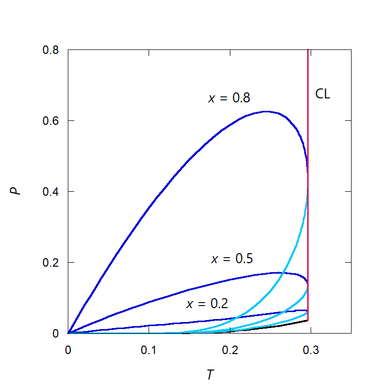 人だまループは理想気体成分のモル分率 \(x\) が増すにつれ、 圧力軸方向に大きく引き伸ばされていきます。 ループの極大となる温度は \(x\) とともに少し低温側に移動しますが、 最終、図 3-1 の並進運動の圧力のループの極大となる温度 0.239... になります。 また臨界温度は組成によらず一定ですから、 臨界線 CL は、純ファンデルワールス流体の臨界点から、 圧力軸に沿ってまっすぐ伸び、 等組成線のループに接します。