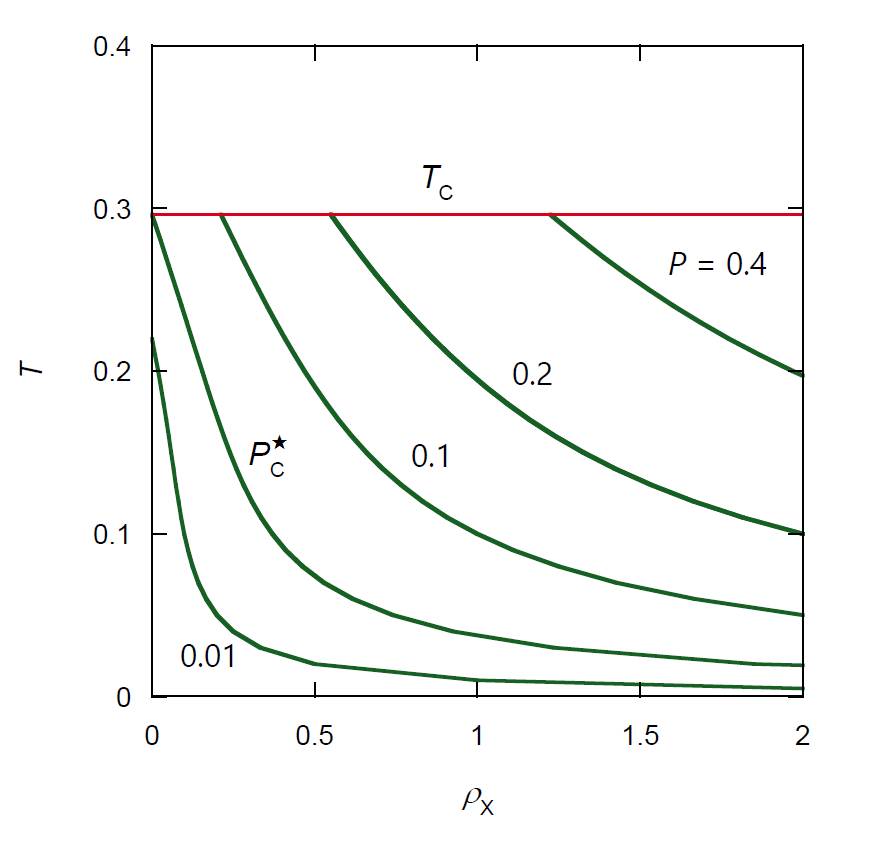 図 5-1 には露点と泡点の温度の理想気体成分 X の密度 \(\rho_\mrm{X}\) 依存性を示しました(露点と泡点の温度は一致します)。 圧力が純ファンデルワールス流体の臨界圧力 \(P_\mrm{C}^\star\) より小さい時には、 等圧線の温度は \(\rho_\mrm{X}\) = 0 で純ファンデルワールス流体の露点・泡点(\({}^{\pm} T^\star\)) から始まって \(\rho_\mrm{X}\) の増加とともに減少していきます。 一方圧力が純ファンデルワールス流体の臨界圧力より大きい時には、 式 \eqref{eq:critdx} で与えられる臨界密度 \(\rho_\mrm{C, X}\) で、臨界温度(\(T_\mrm{C}\)) から始まって減少し、 十分温度が低くなると(\(P \gg {}^{\pm} P^\star (T)\))、 ほぼ \(\rho_\mrm{X}\) に反比例して減少します(\({}^\pm T \approx P/\rho_\mrm{X}\))。