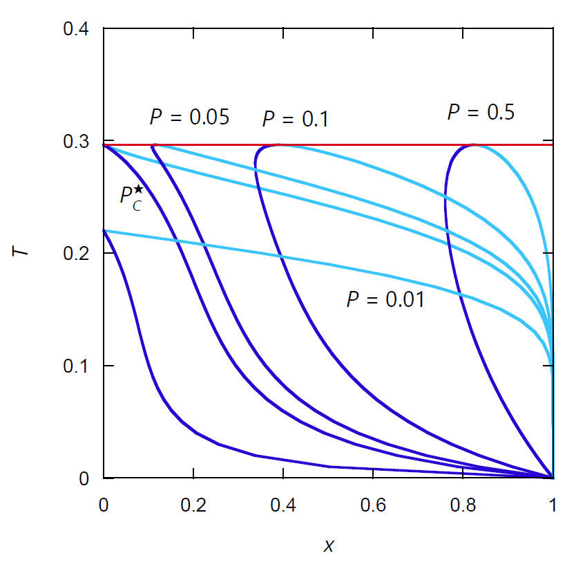 圧力 \(P\) が純粋なファンデルワールス流体の臨界圧力 \(P^\star_\mrm{C}\) より低ければ、 \(x = 0\) で露点と泡点は一致します。 そして理想気体成分 X のモル分率 \(x\) の増加とともに、露点・泡点ともに低下しますが、 モル分率 \(x\) が小さい間は泡点の低下の方が著しく両者の差は拡大しますが、 泡点の低下が落ち着く一方、露点が \(x = 1\) 付近で急速に低下し、両者は \(x = 1\) で \(T = 0\) に収束します。