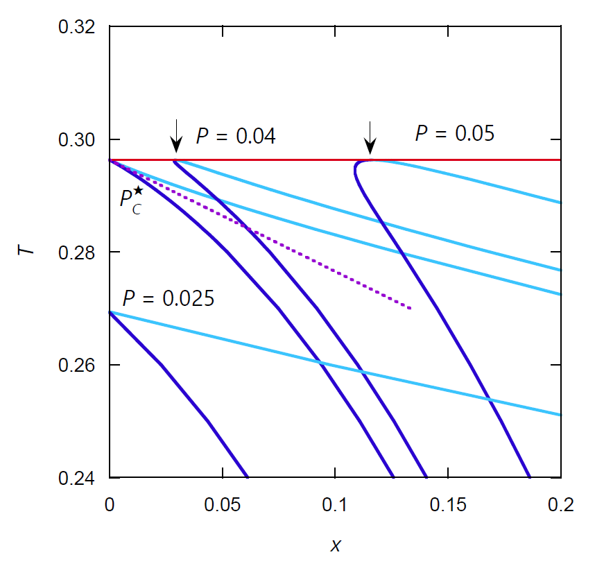 図 5-2b には式純ファンデルワールス流体の臨界圧力(\(P^\star_\mrm{C}\) = 1/27 = 0.0370...)付近の相線と \eqref{eq:mix_mfx} に対応する勾配を描きました。 圧力を下げるとともに露点曲線と泡点曲線が作る人だま型の滑らかなループが、 純ファンデルワールス流体の臨界圧力 \(P^\star_\mrm{C}\) を境に、 先端が嘴(くちばし)型の尖ったループになり、 さらにその嘴が開いていきます。
