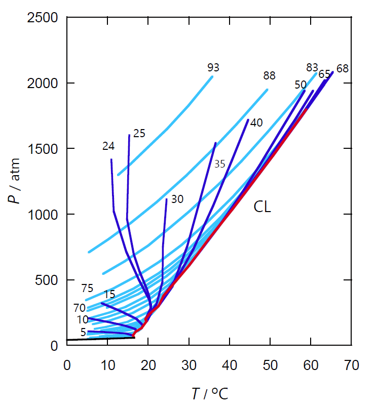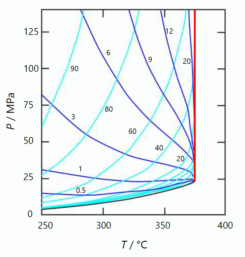 | 図 7-1. 水素 H2- 水 H2O 混合系の温度 \(P\) -圧力 \(T\) 面での等組成の相図。 赤い実線は臨界線 \(T_\mrm{C}\) 。 露点曲線(水色)、泡点曲線(青)に添えた数字は、 水素 H2 のモル百分率。 Seward らによる図を縮尺を変えて改変。 ぼくのトレースが下手くそで、少しガタついていますがご容赦のほど・・・ |