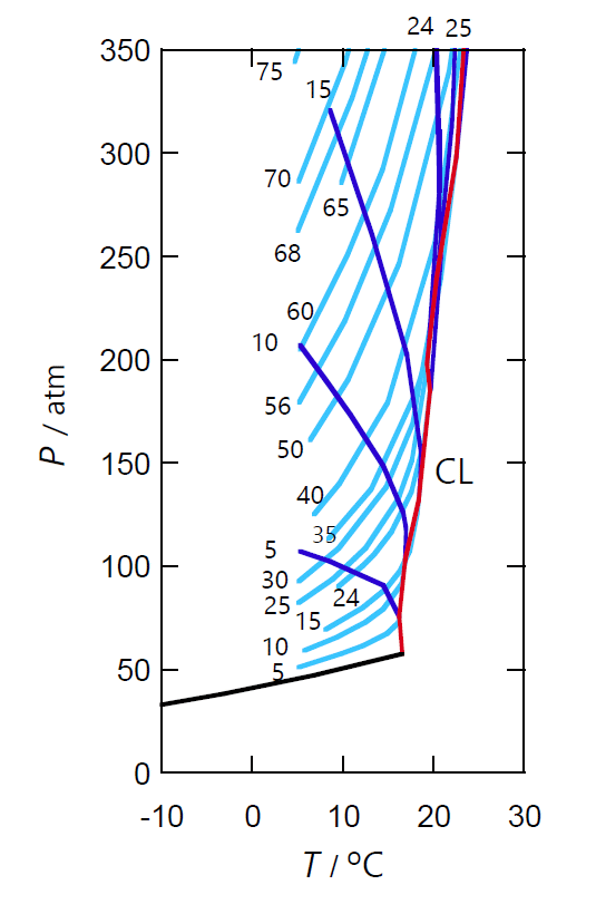 臨界圧力が高くなるのと同様、 水素 H2- 水 H2O 混合系では、 臨界点から温度を下げていった時の泡点の圧力の上昇の度合いは、 理想気液混合物に比してはるかに大きくなり、 理想気液混合物では見られた泡点圧力の極大が認めがたくなります。 実際 \((P, T)\) 面の等組成線で、 水素のモル分率が 0.01 では泡点曲線の極大が確認できますが、 0.03 ではもはや(実験の範囲では)泡点曲線の極大は認められません。 またモル分率 0.005 の段階で温度の低下にともなう泡点圧力の低下は 300 K 付近で認めがたくなり、 理想気液混合物で見られた人だま型のループは(あったとしても)急速に消失していくようです。