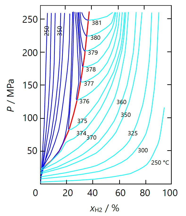 | 図 7-2. 水素 H2- 水 H2O 混合系の圧力 \(P\)-水素モル百分率 \(x_\mrm{H_2}\) 面での等温線。 赤い実線は臨界線 \(P_\mrm{C}\) 。 露点曲線(水色)、泡点曲線(青)に添えた数字は、 温度 \(T / {}^\circ \mrm{C}\)。 Seward らによる図を改変。 トレースが下手くそでガタついています。 | 図 7-3. 水素 H2- 水 H2O 混合系の温度 \(T\)-水素モル百分率 \(x_\mrm{H_2}\) 面での等圧線。 赤い実線は臨界線 \(T_\mrm{C}\) 。 露点曲線(水色)、泡点曲線(青)に添えた数字は、 圧力 \(P / \mrm{MPa}\)。 Seward らによる図を改変。 トレースが下手くそで、いささかガタついています。 |
