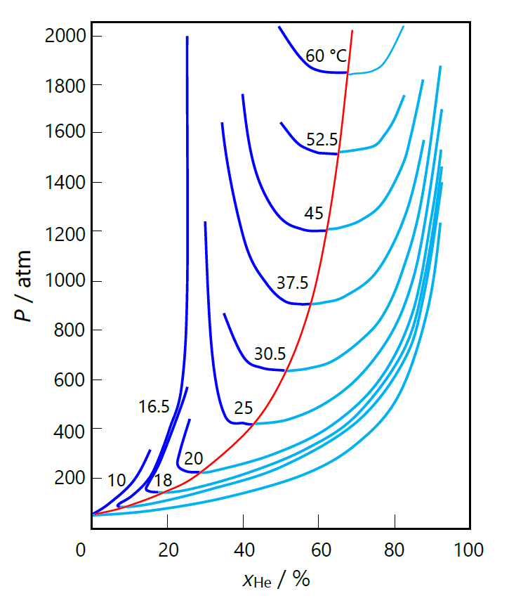 | 図 7-5. ヘリウム He -キセノン Xe 混合物の \((P, x) \)面の等温線。 (de Swaan Arons たちの図を改変)。 露点曲線は水色で、沸点曲線は青で示しています。 図中、赤線は臨界温度での等温線です。 |