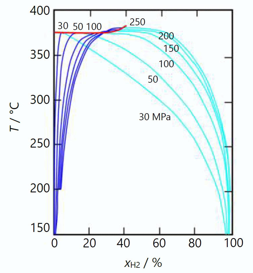 ここで紹介した水素 H2- 水 H2O 混合系の実験は Seward と Frank によるものです。 原報を一読されることとをお薦めしますが、 実験は水素と水を詰めた容器の温度を 450 °C まで上げた後、ゆっくり下げる形で行われました。 目視観測とともに、圧力変化の異常を検知することで相変化をモニターしています。 過酷な条件の実験で、 時として圧力センサーが水素脆性の影響で破裂したりしたようです。 高温高圧の水素が噴出してくるかもしれない中、 水素と水の仕込み量を変えては、圧力容器が冷えていくまで 3 時間くらい付き合うという、 ちょっと引いてしまいそうな実験です。 けれども Frank のグループは 200 MPa、450 °C での水中のメタンの酸素による炎を実現するなど、 強心臓の持ち主たちぞろいのようです・・・。