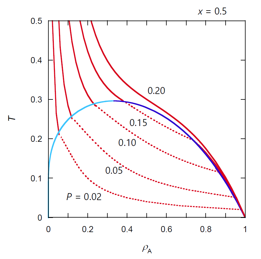 純ファンデルワールス流体の \((T, \rho_\mrm{A})\) 面の等圧線図では、 露点と泡点は同じ等圧線上にあり、 温度・圧力を決めただけでは密度 \(\rho_\mrm{A}\)(あるいは気液の量比)は決まりません。 また臨界圧力の等圧線は臨界点で相線と接し、 臨界圧力以上では気液の相分離は起きません。 けれどもモル分率を定めた理想気液混合物では、 温度・圧力を決めると密度 \(\rho_\mrm{A}\) が定まり、 その温度における純ファンデルワールス流体の飽和密度から気液の量比が決まります(式 \eqref{eq:vlratio})。 また臨界圧力(\(x\) = 0.5 では 11/81)の等圧線は臨界点で相線と交わり、 気液の相分離が起きます。 そして臨界圧力より圧力の高い等圧線では泡点曲線と2度交わる、逆行蒸発・凝縮挙動が現れます。 そしてさらに圧力を上げ \(P\) = 0.171... で等圧線は泡点曲線と接し、 それ以上では気液の相分離は起きなくなります。