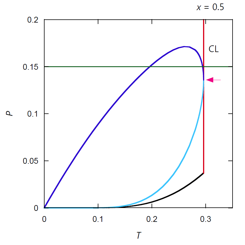 先に理想気液混合物の \((P, T) \)図の議論の中でも指摘したように、 理想気液混合物では1成分のファンデルワールス流体では見られない、 少し変わった挙動が現れます。 図 X-2 には理想気体成分 X のモル分率 \(x\) = 0.5 における泡点・露点曲線の挙動を示しました。 理想気体成分のモル分率 \(x\) = 0.5 の場合、圧力 \(P\) = 0.15 で温度を上げていくと(図の緑の線)、 温度 \(T\) = 0.1961... と 0.2944... で泡点(沸点)を通過します。 つまり \(T\) = 0.196 で液体が沸騰して気液共存状態になった後、 さらに温度を上げると今度は蒸気の凝縮が起きるようになり \(T\) = 0.294 で液体にもどるわけです。 この温度を上げて蒸気が凝縮するという現象を(広い意味で)逆行蒸発 retrograde evaporation と呼びます。