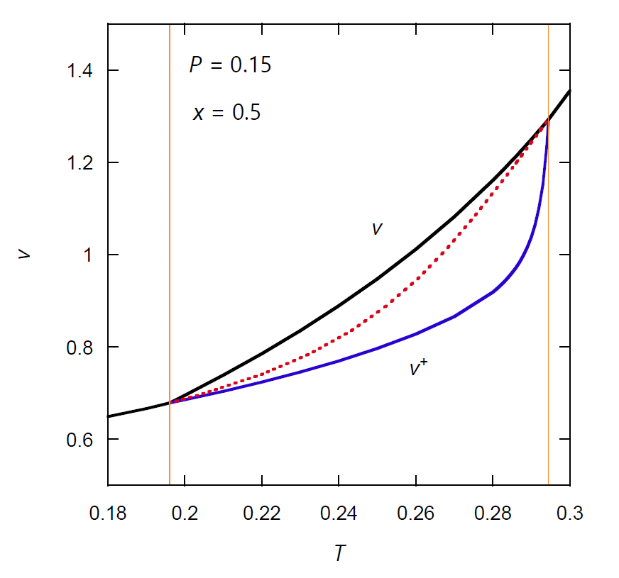 実際の実験操作に照らすと、全物質量(\(n_\mrm{A} + n_\mrm{X}\))と圧力が一定で、 体積が可変の状態を想定した方が、逆行蒸発・凝縮挙動をイメージしやすいかもしれません。 図 X-5 には圧力 \(P\) = 0.15 で理想気体成分 X のモル分率 \(x\) = 0.5 の場合の 理想気液混合物のモル体積 \(v\)(\(= \rho^{-1} = V/(n_\mrm{A} + n_\mrm{X})\)) の温度変化を示しました。 温度を上げていくと \(T\) = 0.196... で蒸気の生成が始まり、 \(T\) = 0.28 で蒸気相の比率が減少に転じ、 0.294... で蒸気相が消失します。