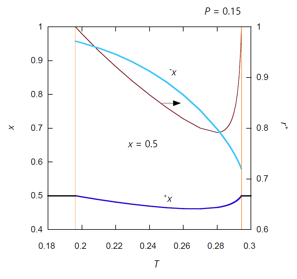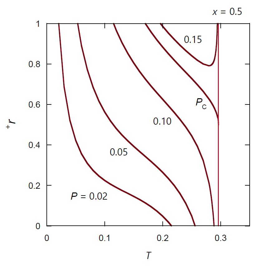 図 X-4 にはモル分率 \(x\) = 0.5 の気液共存状態の理想気液混合物の液相の体積比 \({}^+ r\) が、 種々の圧力で温度とともにどのように変化するかを示しました。 圧力が臨界圧力 \(P_\mrm{C}\)(\(x\) = 0.5 では 11/81 = 0.1358...)では、 臨界温度 \(T_\mrm{C}\)(= 8/27 = 0.296...)で液相の体積比 \({}^+ r\) は 1/2 になって気液共存状態が解消します (臨界点近傍では \(\rho_\mrm{A} \approx ({}^+\rho_\mrm{A} + {}^-\rho_\mrm{A})/2\) です)。 臨界圧力以下では通常みられるように、温度を上げるにつれて蒸発が進み液相が減っていき、 最終すべてが蒸気相になります。 しかし臨界圧力以上では温度を上げるにつれて最初は蒸発が進み液相が減っていくのですが、 途中で凝縮が起きるようになって液相の体積比は増加に転じ(逆行蒸発)、 最終すべてが液相になります。