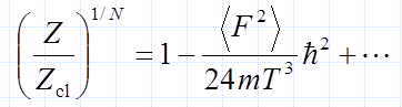 このような話が出てくると、 「量子力学的な効果があるから気体中の方が運動が激しい」 といったことを考える人がいるかもしれません。 量子論的な効果がどれほど現れるかを評価する方法として、 平面波基底を用い状態和(分配関数)Z を、プランク定数 hの巾で展開する手法があります。 それによると状態和に対する量子論的な補正は次式で表わされます (添え字の cl 古典的に扱った場合を意味します。ここでは記号等の詳細は無視して眺めてください):