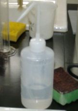 洗瓶にもいろいろ種類がありますが、ここで使うのはポリエチレン製(キャップはポリプロピレン製)で、 瓶の中に先を細くした管を突っ込んだものです。 瓶を押さえると、管の先から水が出てきます。 アセトンなど蒸気圧の高い溶媒を使う場合には、あまり気密性が高すぎると、室温が高くなった時瓶の内圧が上がり、 中の溶媒が洩れ出てきます。 ですから圧抜きの細工を施した洗瓶を使うのがお薦めです。