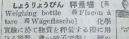 なお「秤量瓶」を、今日「ヒョウリョウビン」と読み慣わしていますが、正しくは「ショウリョウビン」であるようです (漢和辞典の中には「ヒョウリョウ」という読みを誤読としているものもあります)。 現に戦前に刊行された理化学辞典(増補版。1939年)には、「しょうりょうびん」とあります(右の写真)。 たまたま大正14年生まれの方にこのことをお聞きしたところ、 「講義で先生が、『正しくは秤量をショウリョウと読むが、ヒョウリョウと読む人が増えている』と言っておられた」 とのことでした。 漢学の素養のない世代に入るに従って、こうした読みも移り変わっていくわけでしょうか・・・