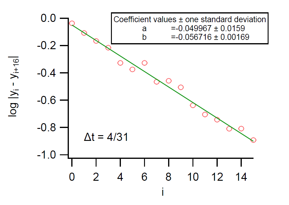 この手法は、\(N\) 個のデータ \(\{y_i\}\) から3つのパラメータ \((y_0, A, k)\) を決める問題を、 \(N - M\) 個のデータ \(\{z_i\}\) から2つのパラメータ \((A’, k)\) を決める問題に焼きなおすことで、 取り扱いやすくしていることに相当します。 また常用対数を扱う上で頻出する log e = 0.434(あるいは ln 10 = 2.303) という数値を敢えてあからさまに出しておきました (われわれ世代以上はたいてい暗記している(た))。