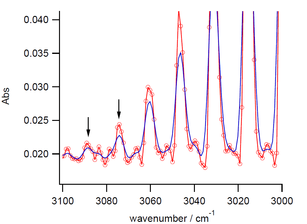 | 図 2. HClの振動回転スペクトルに平滑化を施した例 (Binomial smoothingを5に設定。青線) |