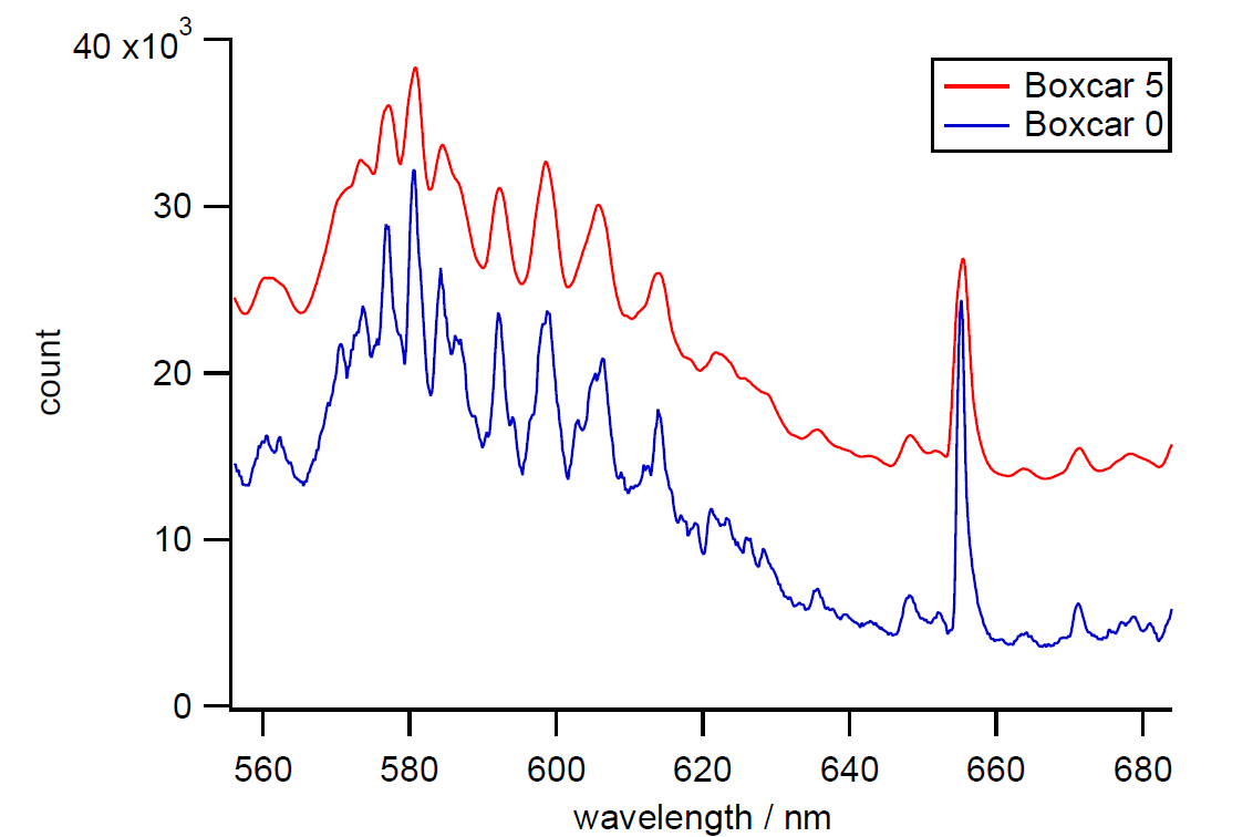 中には何も考えずに設定していた人がいるかもしれませんが、CHEMUSB4 の分光光度計を使う時、 Spectra Suite で Boxcar の設定を 5 にするように指示されていました。 この設定をすることでスペクトルが滑らかなものになったと思います。 CHEMUSB4 では受光素子がおよそ 0.2 nm 間隔で光の強度を検知するように配置されおり、 Boxcarの設定を 5 にすると、対象の受光素子の周辺の 5 個分の素子の平均を出力することになります。