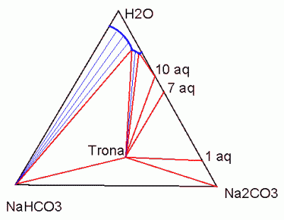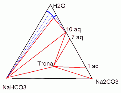 たとえば等モルの炭酸ナトリウムと炭酸水素ナトリウムを水に溶かして蒸発させたからといってトロナは析出せず、炭酸水素ナトリウムが析出してくるだけです。 さらに氷で冷やしたりすると、どんな割合で混ぜようが、トロナは出てこずに炭酸水素ナトリウムか炭酸ナトリウムが出てくるだけです。 あるいはトロナの結晶を水で洗浄すると後に炭酸水素ナトリウムが残ります。