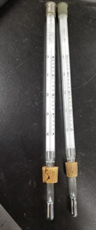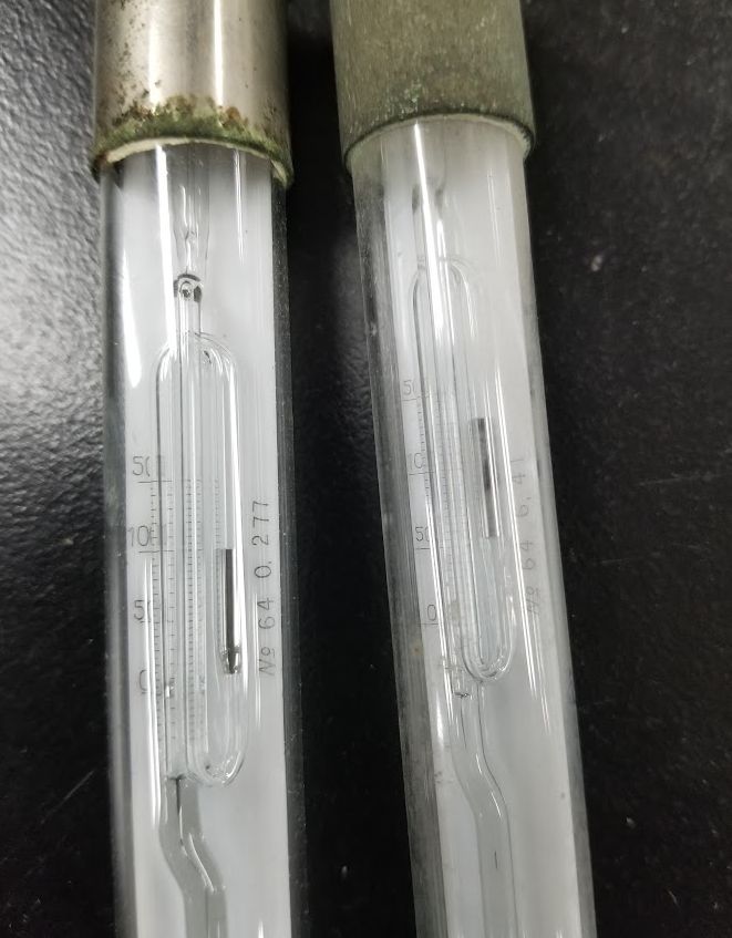 | 図 V-6a. ベックマン温度計。 左側は凝固点降下用、右側は沸点上昇用。 | 図 V-6b. ベックマン温度計の上部。 右側のベックマン温度計は、長年の使用で少し疲れ気味・・・ |