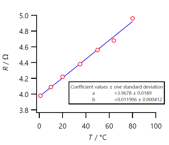 なお時間に余裕があった時には、 金属の温度依存性も調べてもらったこともありました。 講義や教科書で知ってはいても、やったことのない学生が大半で、 実際にはかってみるとサーミスター・半導体との違いが明瞭です。 超伝導の課題で電気抵抗の測定があるのですが、 4 線式の抵抗測定などの前に、こうした素朴な実験をやっておくのは、 よい足慣らしになるかと思います。 図 V-4 に示すのは直径 0.1 mm の銅線を 2 m ほど取って、 抵抗の温度依存性を調べた例です。 これで銅 Cu の抵抗率を計算すると 25 °C で 1.7 × 10-8 Ω m になり、文献値と一致します。 一方温度係数は 2.8 × 10-3 K-1 で、 文献値 3.9 × 10-3 K-1 より3割がた小さくなっています。 これは使用した銅線の銅の純度等に何か秘密があるのかもしれません。