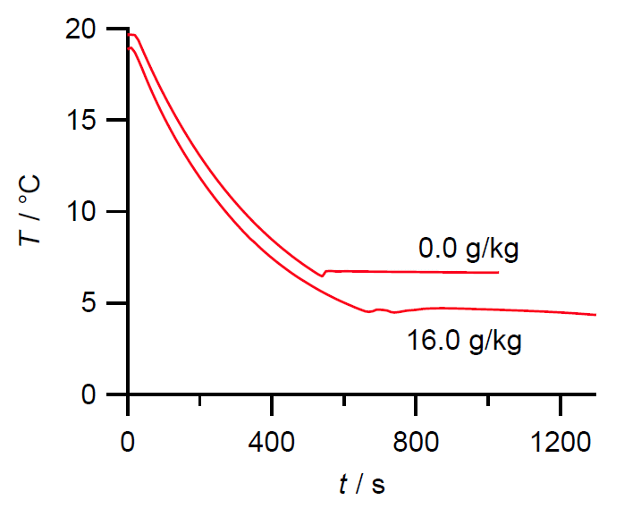 さて図 V-2 にシクロヘキサンを溶媒に、ビフェニルの凝固点降下を調べた実験例を示しました (これはぼくがやった予備実験の結果で、あまり美しくはないですが、 それでも学生諸君よりはましだと自負しています)。 溶液はビフェニル \(m_\mrm{X}\) = 69.4 mg を取って、 シクロヘキサン \(m_\mrm{S}\) = 4.34 g に溶かして調製しました。 凝固点降下度 ΔT は 2.10 °C になり、 シクロヘキサンの凝固点降下度 Ef = 20.8 K kg mol-1 なので、ビフェニルのモル質量は