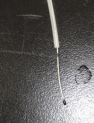 図 V-3. 実験に使用するサーミスター。 SEMITEC の 103ET-1。下部の黒い粒が感温部。 |