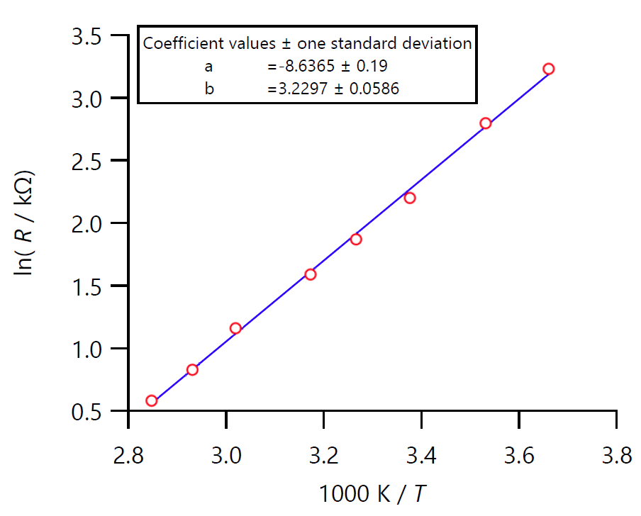 サーミスターの電気抵抗 R の温度依存性は、次のアレニウス型の式で表わされる :